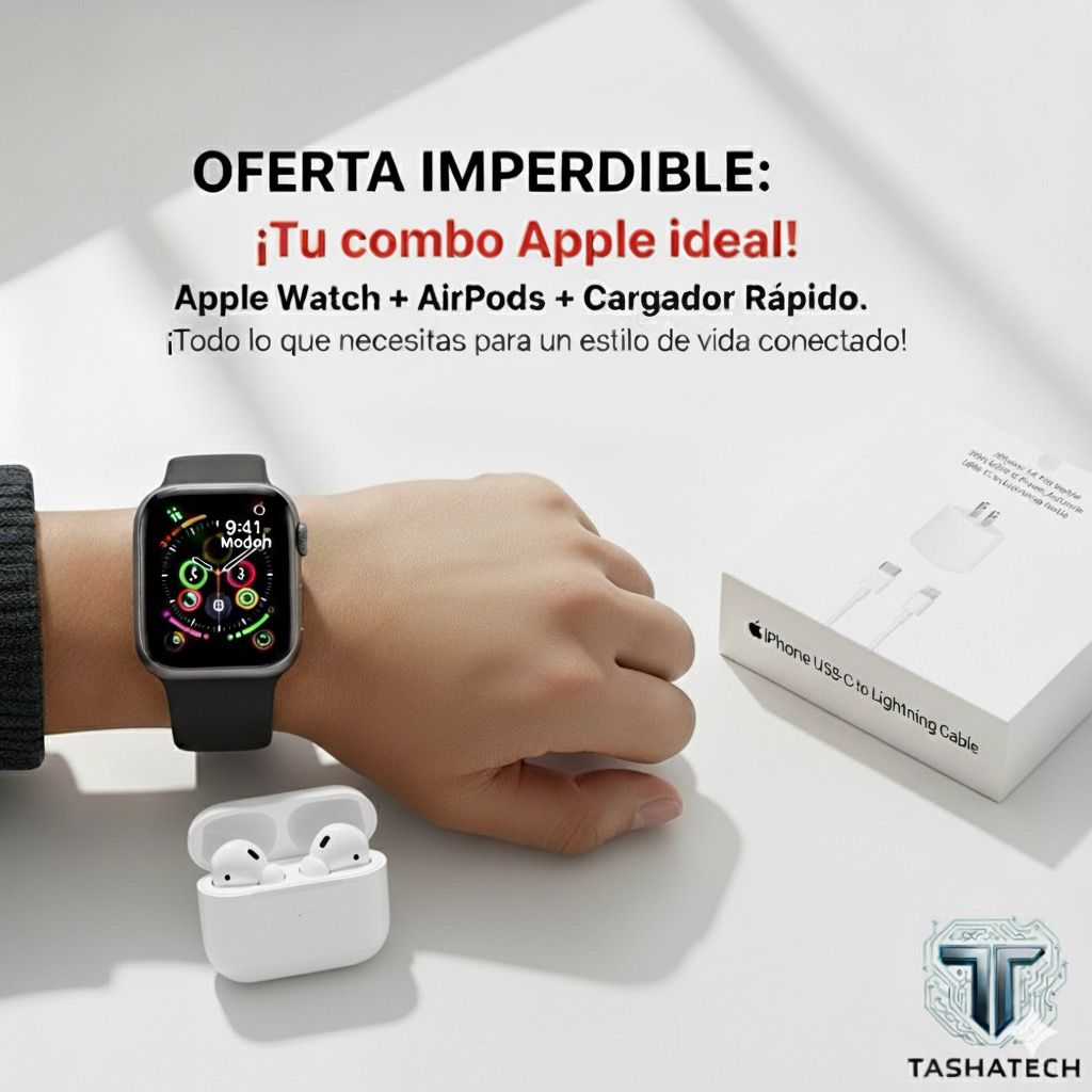 ¡No busques más! Llévate el ecosistema Apple completo en una sola compra y ahorra. 🤑 Este paquete incluye todo lo que necesitas para empezar: tu nuevo Apple Watch ⌚, un cargador para mantenerlo siempre listo 🔌 y audífonos para disfrutar de tu música y podcasts favoritos 🎧. La combinación perfecta de tecnología, comodidad y precio. ¡Unidades limitadas! 🏃♂️💨